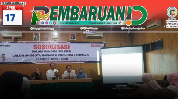 kspsi-aceh.or.id/ – Badan Pengawas Pemilihan Umum (Bawaslu) Provinsi Lampung menyelenggarakan Sosialisasi Seleksi Calon Anggota Bawaslu Provinsi Lampung Periode 2023-2028.